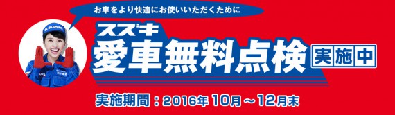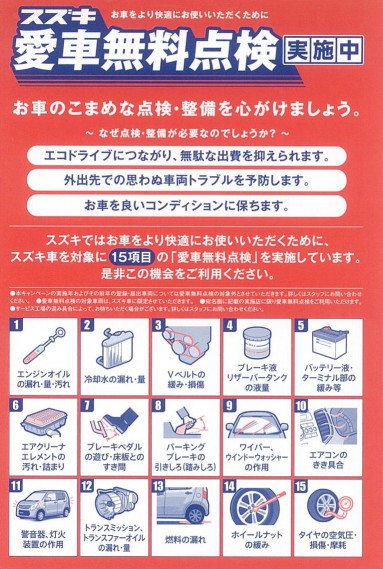 愛車無料点検実施中☆彡 2016年10月5日 未分類 今年もスズキ車限定!の愛車無料点検の時期が来ました♪15項目もの点検が無料で受けれますので是非この機会にご来店ください(*^o^*)(2015~2016年登録の車は対象外になります) URL Copied!