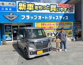 下松市 H様スペーシアカスタム納車です🌟ターボで加速がよく、9インチ全方位モニターがついてて、両側電動スライドドアなのでドアパンの心配もなくなりますね🍀✨ |