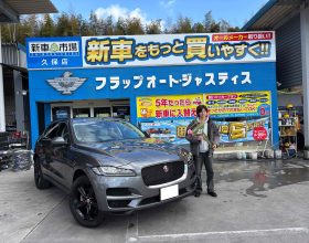 周南市 Y様ジャガー納車です🌟外車ならではのクールな顔つきでサイズ感もとっても大きくてかっこいい😎💕色もガンメタでとってもお似合い✨運転がもっと楽しくなりそうですね🍀 |