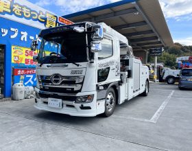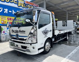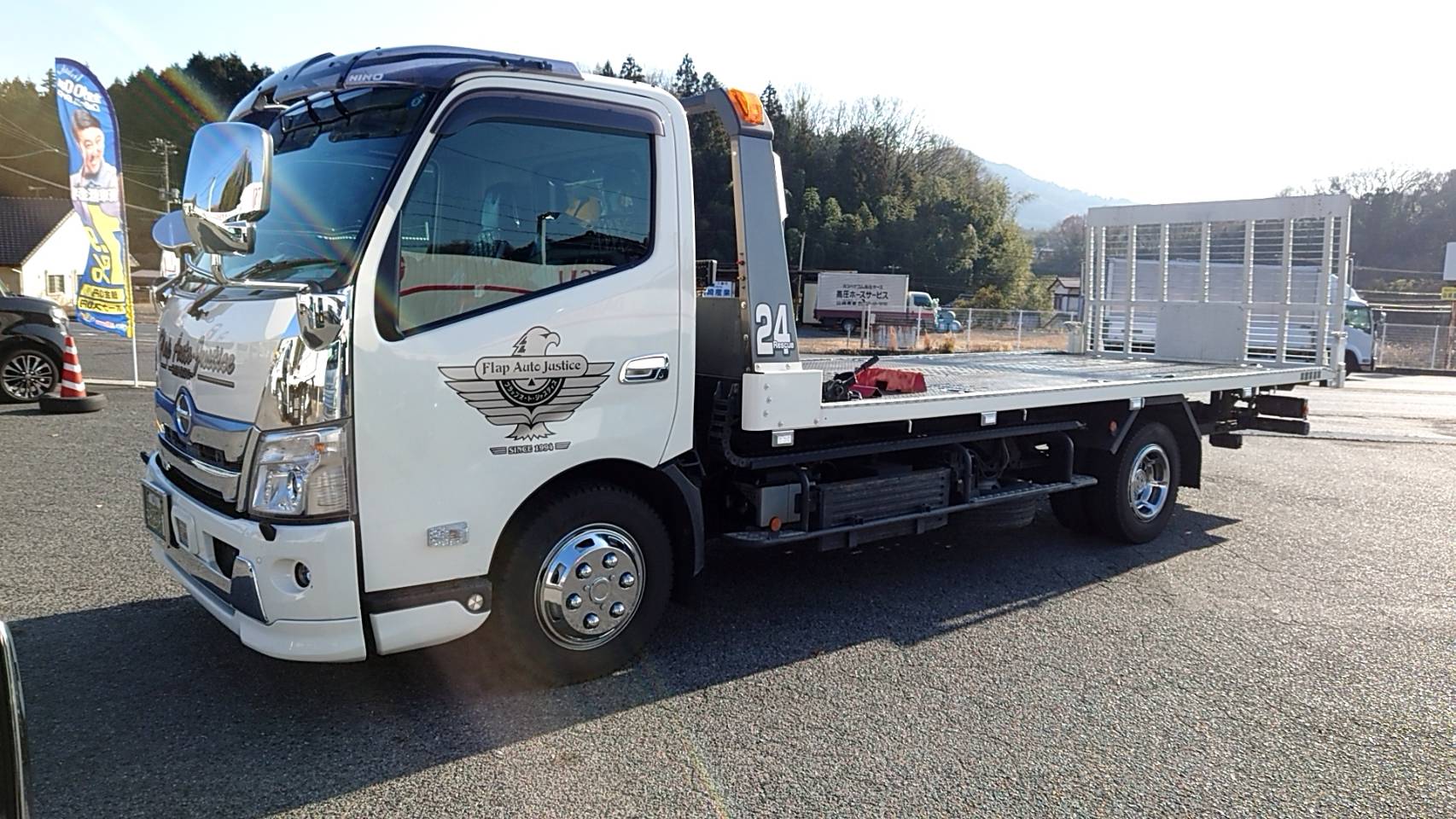 フルフラットになる積載車。事故や故障時に、長距離搬送や車高が低いお車などの搬送を安全に行います。